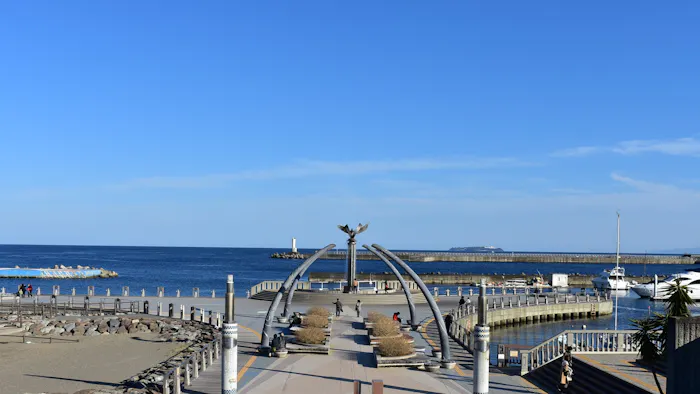 熱海サンビーチと親水公園の中央に位置する「渚親水公園・ムーンテラス」は、恋人の聖地にも認定されています。海に突き出すように造られた憩いのスペースには、モニュメントやベンチなどがあり、撮影スポットとしても知られています。