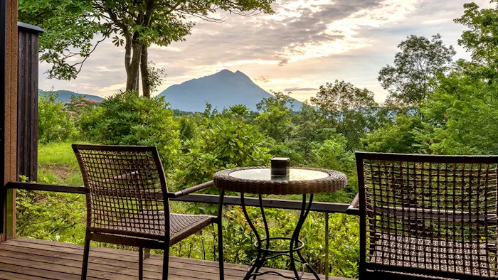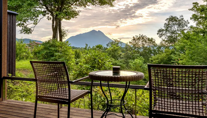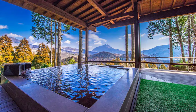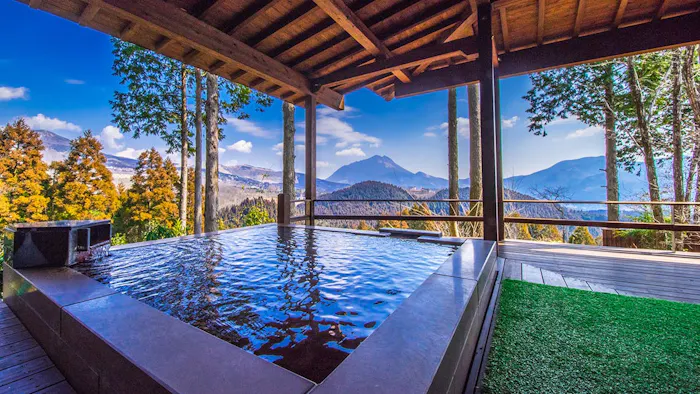 たとえば「PREMIUM スイート>由布岳一望/露天付離れ【くぬぎ】」には広いウッドデッキに露天風呂まで備わって、湯船から見る由布岳のなんと壮麗なこと!弱酸性と弱アルカリ性、敷地内から湧き出る2種の単純泉を混合した湯を、好きな時に好きなだけ利用できますよ。