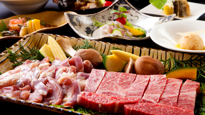 湯浴みの後は、宿が胸を張って提供する創作懐石料理を楽しみましょう。メイン食材は「おおいた和牛」。コンロで焼くか、すき焼きでいただくか、悩ましいところですが、こんな迷いならいつでもウエルカム。大歓迎です。