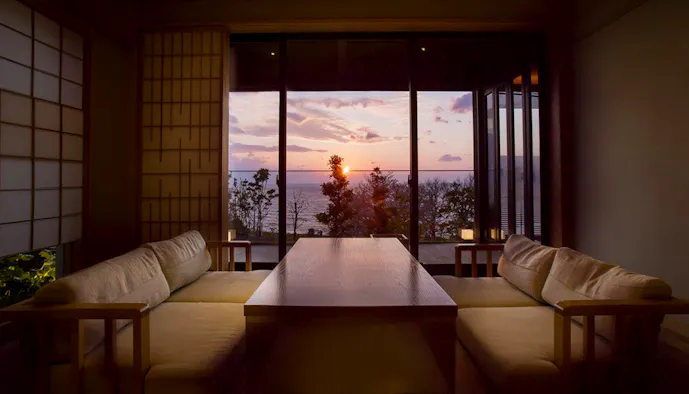20ある客室は、すべてオーシャンビュー。温泉露天風呂付の「離れ季音庵(きねあん)」の6室から眺める夕日の美しさは、筆舌に尽くし難いほど。波の音、漁火、星空。京丹後らしいインテリアに包まれて過ごす時間は、心からリラックスできそうです。