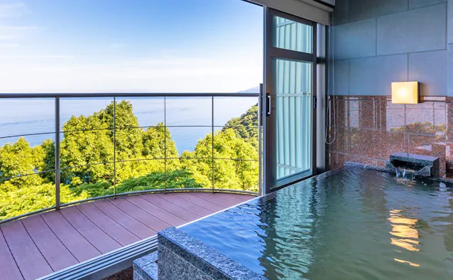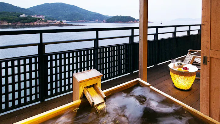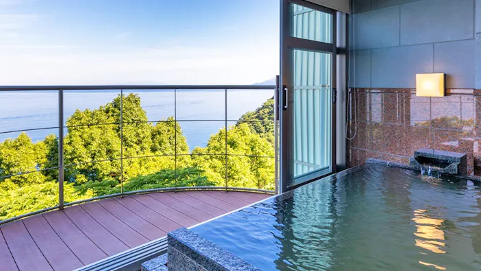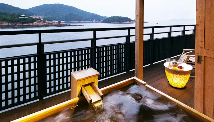 17ある客室すべてがオーシャンビューの温泉露天風呂付。「プライベートな寛ぎ【アッパースイート77~95平米】-部屋食」の露天風呂からももちろん、朱塗りの弁天堂を載せた弁天島や仙酔島を一望。潮風に吹かれ、波音に包まれた温泉時間を楽しめますよ。