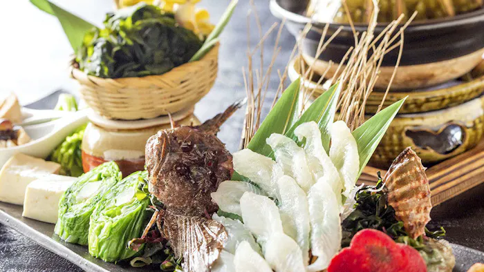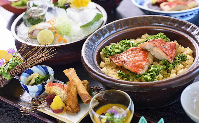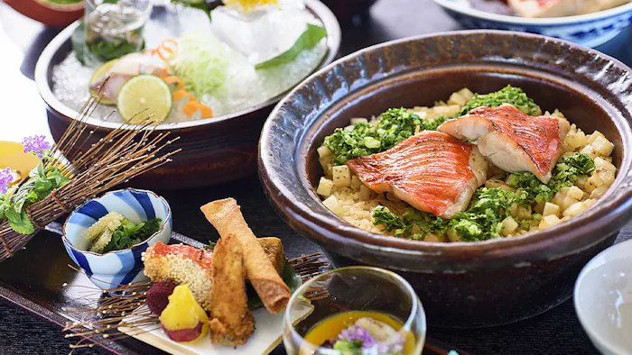 料理旅館を名乗るだけあって食事も自慢。アワビやオコゼのしゃぶしゃぶ、鯛めしなど、新鮮な海の幸尽くしの御膳に歓声が上がります。