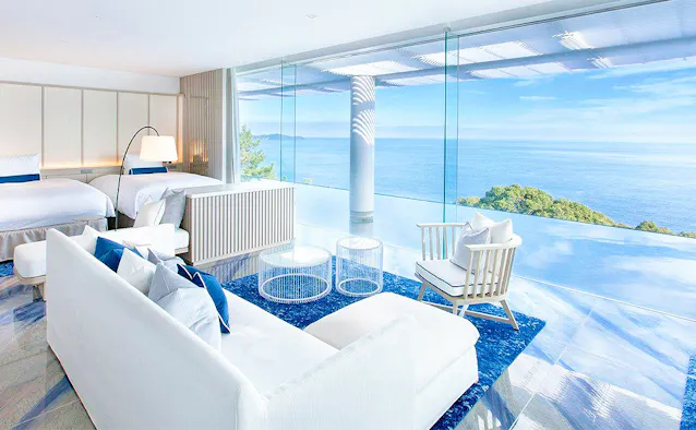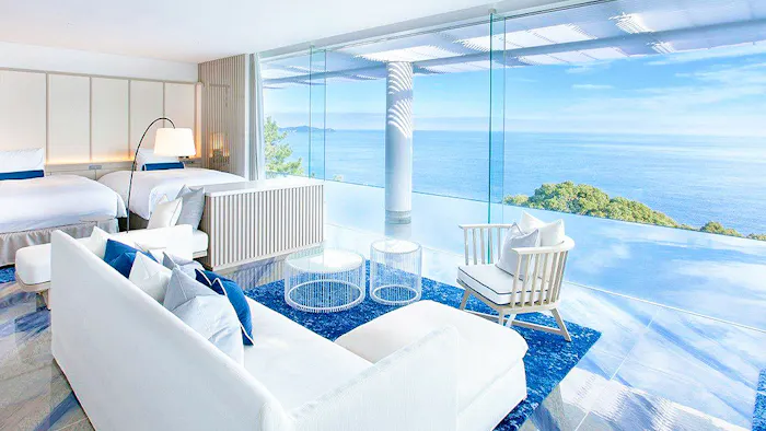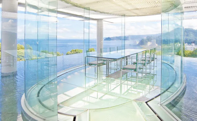 熱海駅から車で5分ほどの高台に佇む、全4室のラグジュアリーリゾート「ATAMI 海峯楼」。有名建築家・隈研吾氏が手掛けた建物は、水とガラスのアート作品を散りばめた幻想的な空間です。客室では、窓の向こうに雄大な相模湾を一望。2つのタイプがある「LUXURY SUITE」には、熱海温泉の湯を湛えた露天風呂が備わります。