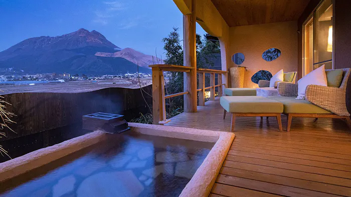 雄大な由布岳の下、稲穂を揺らして走るJR九州の豪華列車「ななつ星」。鉄道ファンでなくても心が躍る、そんな絶景に癒される宿「Yufuin Luxury Villa -zakuro-」。