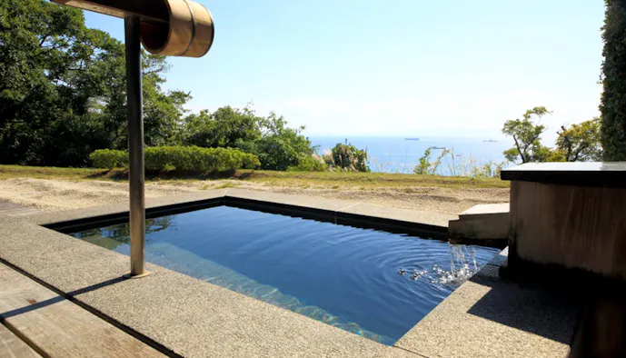 こんなにも海は、空は、広く大きいのか。伊勢湾を望む高台に立つ「知多半島 海のしょうげつ」を訪れる人を虜にするのが、すぐそこにある海。「水平線が180度の弧を描く」と表現するゲストもいるほどで、それほどに雄大な伊勢湾を、全室の露天風呂から眺めて過ごせます。特におすすめは「伊勢湾を望む 露天風呂付平屋客室A 67平米【禁煙】」。ウッドデッキに備えた湯船を満たすのは、地下1,300メートルから湧き出る「白砂の湯」。皮膚病などに効果が期待できるナトリウム・カルシウム-強塩化物・強食塩泉です。