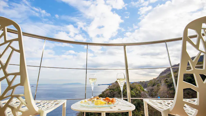 「ホテルふたり木もれ陽」は、静岡県・伊東市にある全10室のリゾートホテル。相模湾から伊豆大島までを見渡す高台にあり、全室に源泉掛け流しの専用風呂を完備。どこまでも続く水平線に溶け込むような心地で、温泉と絶景を満喫するひとときが叶います。