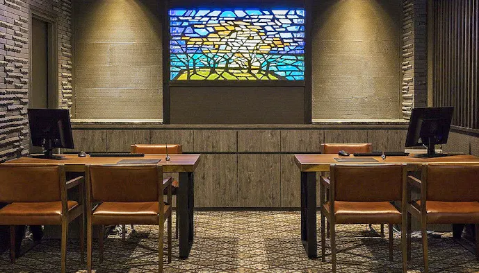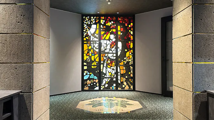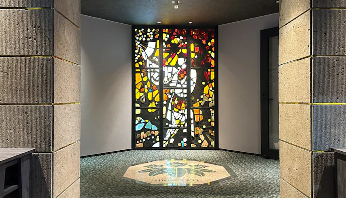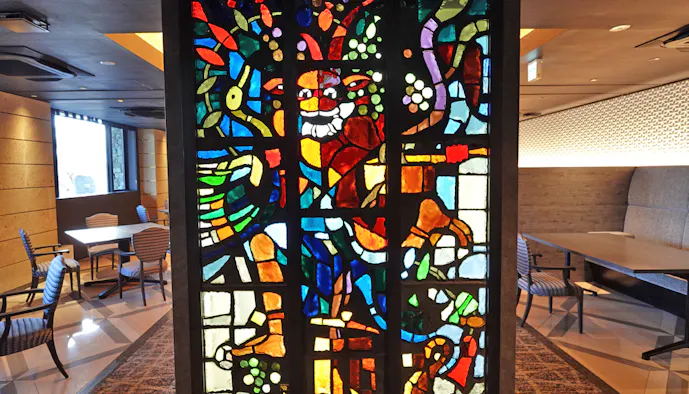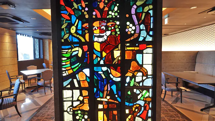 館内へ一歩足を踏み入れると、まず目に入ったのが色鮮やかなスカルプチャードグラス。フランスのステンドグラス作家・ガブリエル・ロワールの作品です。「鬼怒川金谷ホテル」などの系列ホテルにも、ロワールのアートが所有されています。