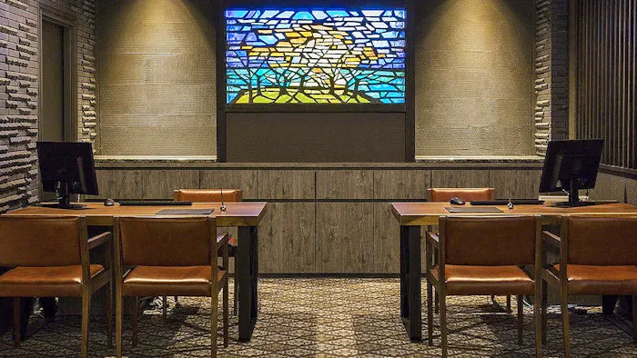 入口では、エントランスと同じくガブリエル・ロワールのスカルプチャードグラスがゲストを迎えてくれます。レストランは、大谷石の質感をアクセントにしたモダンなデザインが特徴。窓の外には木々の景色が広がります。