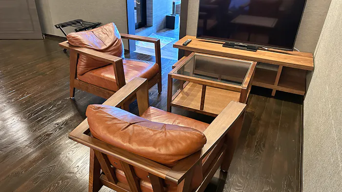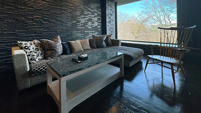 窓が大きく開放感溢れるリビングには、ソファスペースはもちろん、ダイニングテーブルやシンクも完備。テーブルの上にはビターチョコを挟んだクッキー「かなやの和風チョコサンド」と、「金谷ホテル観光グループ」のショコラトリー「JOHN KANAYA」のフィナンシェが用意されていました。