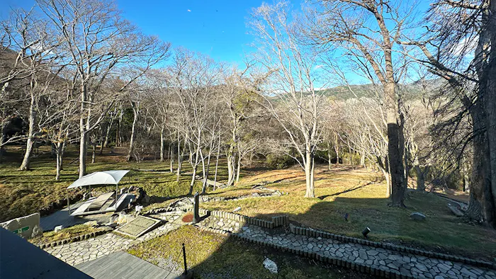 窓からの眺め。左側に見える屋根付のベンチスペースは「フォレストテラス」。