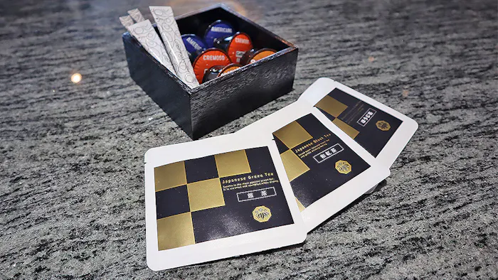 コーヒー用のカプセルのほか、ホテルオリジナルの煎茶・和紅茶・ほうじ茶のパックも。さらにドリップコーヒーも用意されていました。