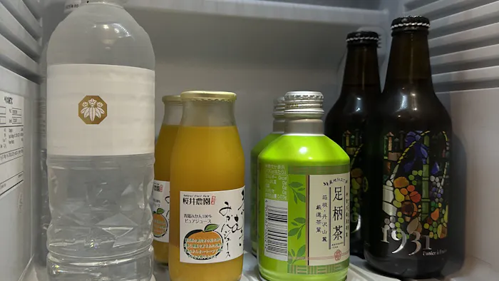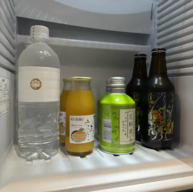 冷蔵庫には、お茶とみかんジュース、そして煌びやかなラベルが目を惹くオリジナルラベルのクラフトビールが。すべて無料でいただけます。