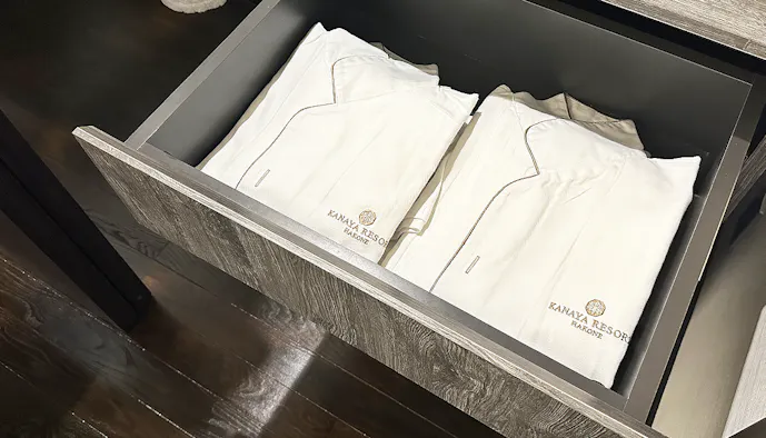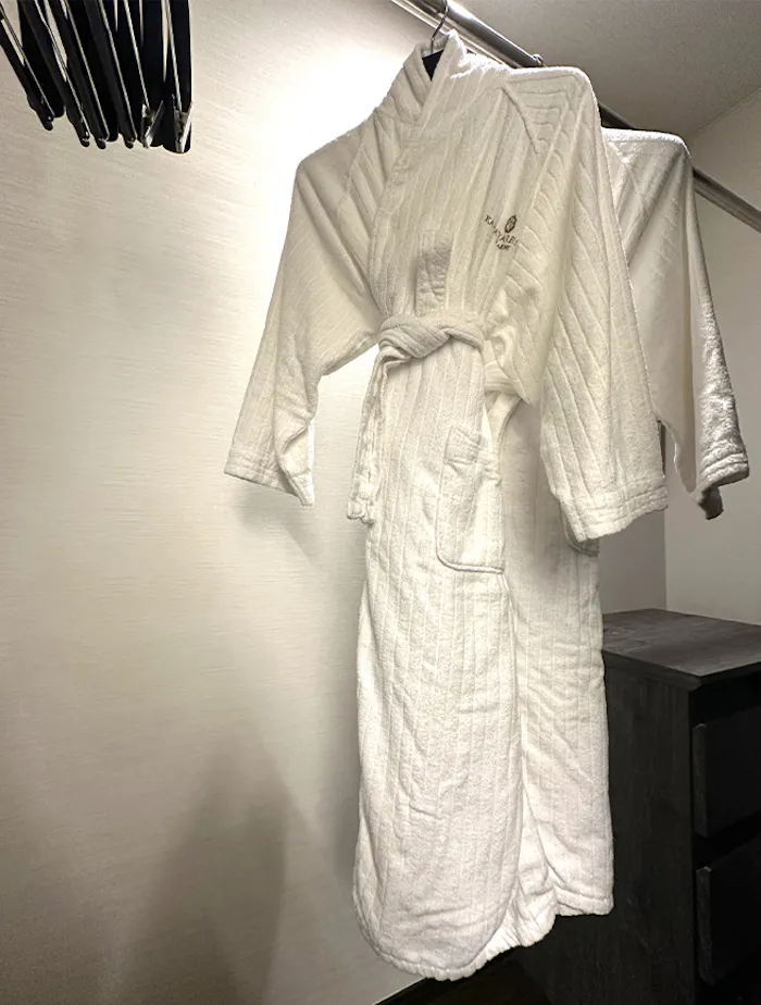 クローゼットには、ホテルのロゴが入ったバスローブとセパレートタイプのパジャマがありました。