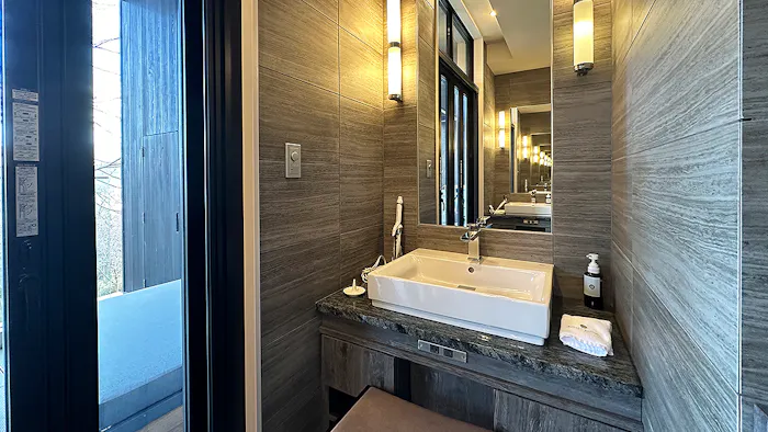 ベッドルームの横に洗面台とシャワールーム、そして露天風呂が。