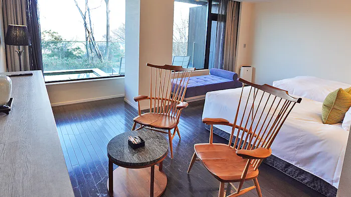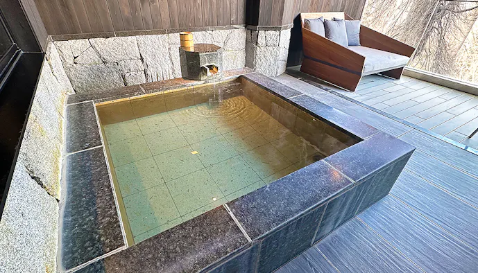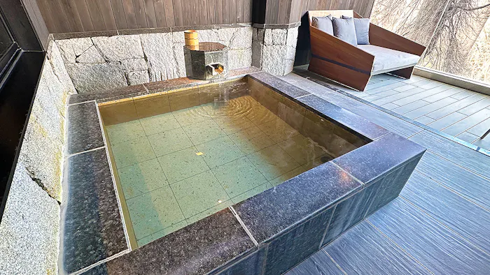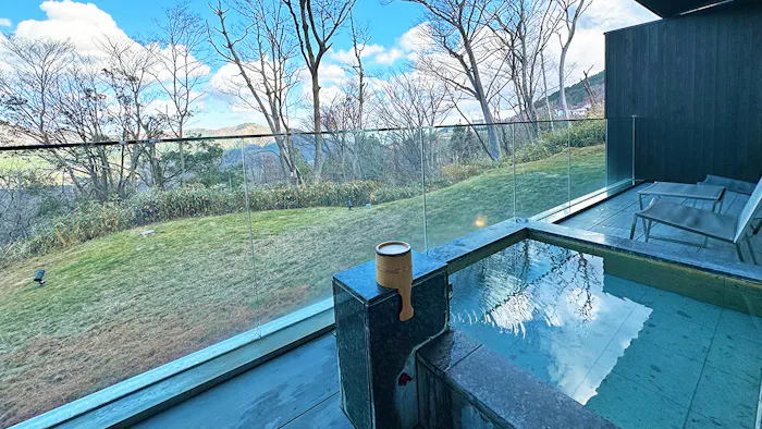 全室に掛け流しの温泉風呂が付いているのも「KANAYA RESORT HAKONE」の特徴。十和田石で造られた浴槽に注がれるのは、美肌の湯としても知られる大涌谷温泉です。