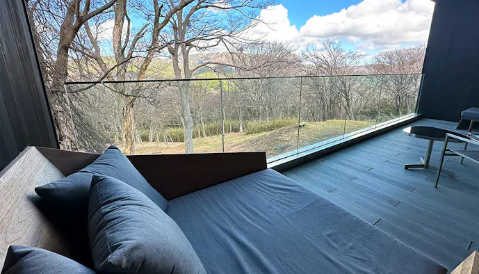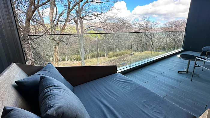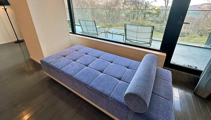 テラスに椅子とテーブルがあるだけでなく、室内にも窓際にデイベッドが置かれているため、外の景色をゆっくり眺めることができます。