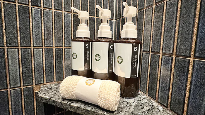 レインシャワー付のシャワールームには、ラグジュアリーホテル専用ブランド「TAYIV(タイヴ)」のシャンプーやボディーソープが。ホワイトティーの香りが爽やかです。ハンドシャワーのヘッドはもちろん「ReFa」。