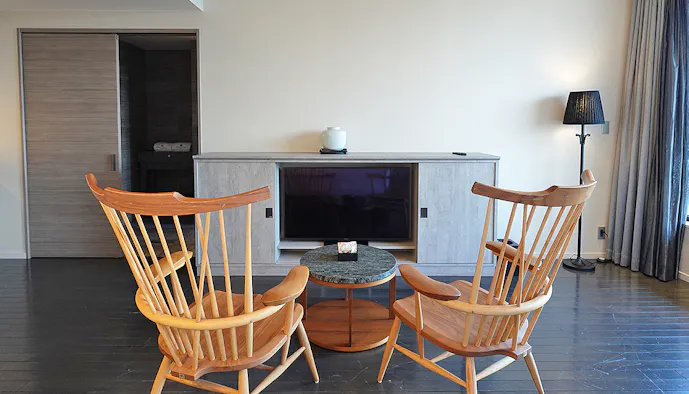 最初に見学したのは、ジョン・カナヤの名を冠した「John Kanaya Suite(ジョンカナヤ・スイート)」。一室のみ、最上位タイプの客室で約113平米と、ゆとりたっぷり。スタイリッシュな空間に、上質な調度品や絵画などが散りばめられています。