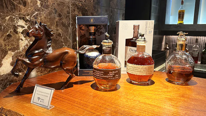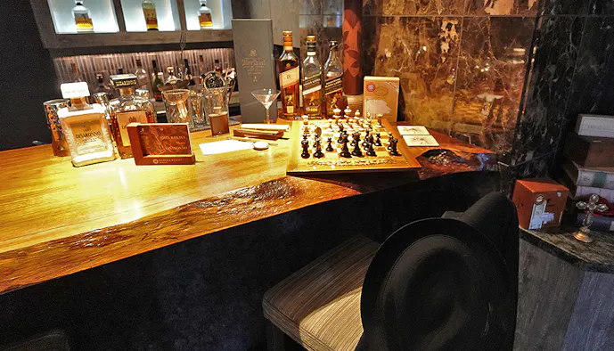 一枚板のカウンターの片隅には、遊び心溢れる装飾が。椅子に掛けられたままのジャケットやハット、シガーにチェス……まるでジョン・カナヤが座っていたかのような雰囲気です。