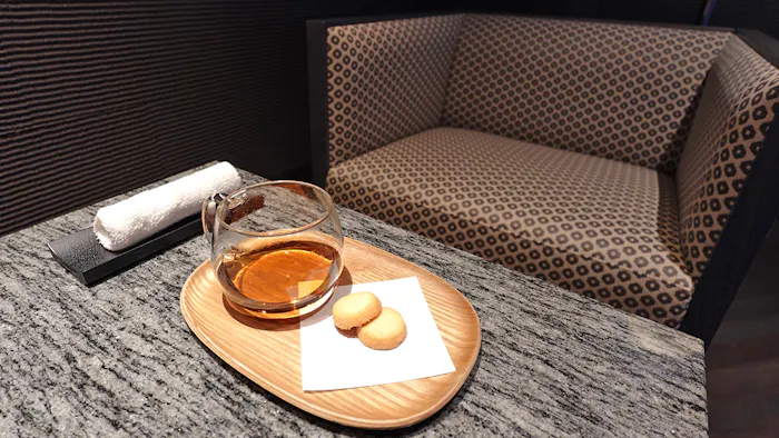 チェックイン時に提供されるハーブティーとクッキー。クッキーは「金谷ホテル観光グループ」の、カフェ併設の焼き菓子店「金谷菓子本舗」の商品です。お土産に購入される方も多いのだそう。
