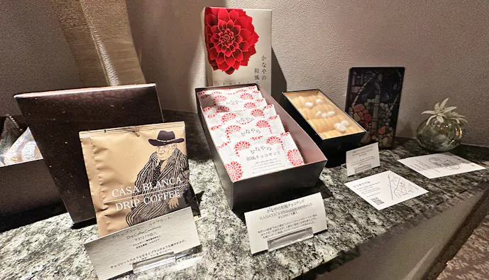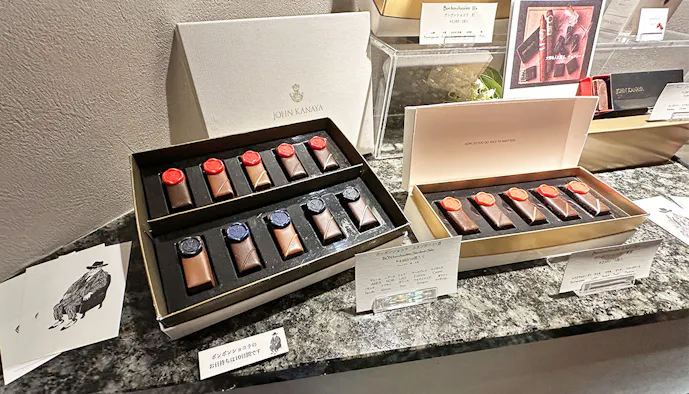 最後はスーベニールをチェック。系列店にショコラトリー「JOHN KANAYA」を持ち、スイーツにも好評を博す「金谷ホテル観光グループ」。ショコラをはじめとする自慢のアイテムは、客室やラウンジ&バーでいただけるのはもちろん、お土産に購入することも可能です。