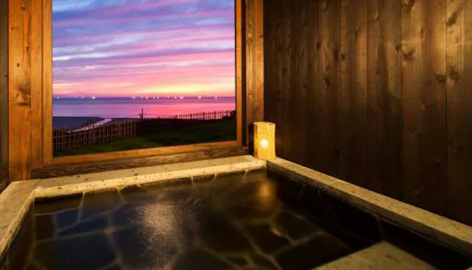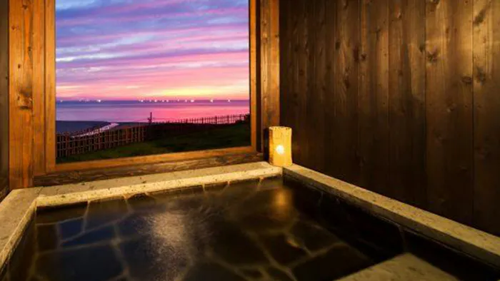 約53平米で、目の前が海!圧巻の夕日ショーを、温泉に浸かりながら、ウッドデッキで海風に吹かれながら、あるいはベッドで寝転びながら楽しむことができますよ。ユニークなのは、スタッフが食事を一時ストップしてでも夕日の鑑賞を勧めてくれること。それほどに感動的な夕景なのでしょう。この宿はドリンクインクルーシブ。但馬牛や松葉ガニなどと並んで、夕日も“もう1杯!”をうながしてくれるに違いありません。