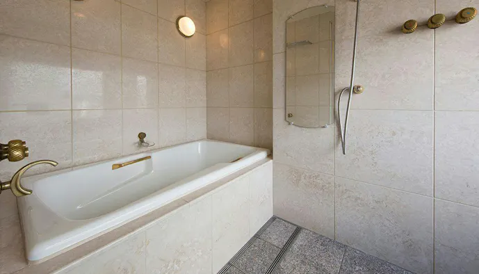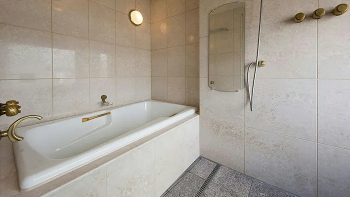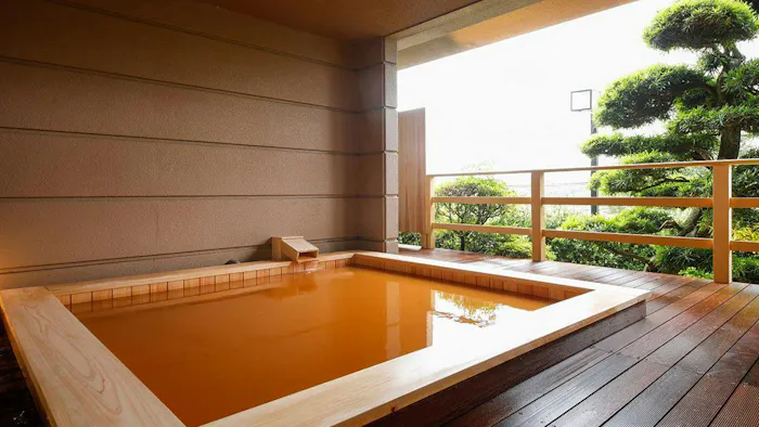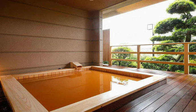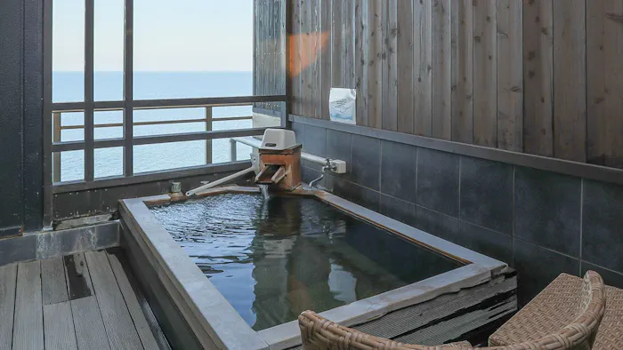 半露天風呂にはナトリウム塩化物泉の湯が引かれており、掛け流されています。充実したクロークスペースやミニキッチンまで備えてあって、自宅にいるような寛ぎと、旅先にいるわくわくと、どちらも味わえるのが魅力です。