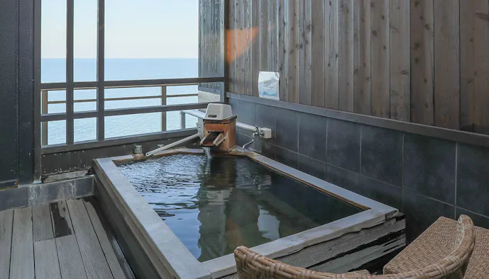 「夕日百選」に選ばれている京丹後の夕日ヶ浦温泉。「夕日ヶ浦温泉 旅亭 櫂‐KAI‐」は、「海岸まで徒歩30秒」というロケーションとあって、美しい夕日を眺めるには絶好の宿。その特等席となるのが、2023年10月にリニューアルした「【オーシャンフロント】温泉露天付和室-ツイン-【禁煙】」です。