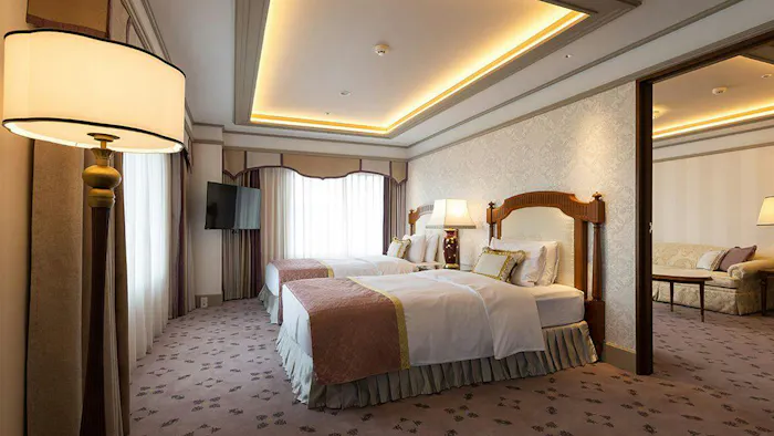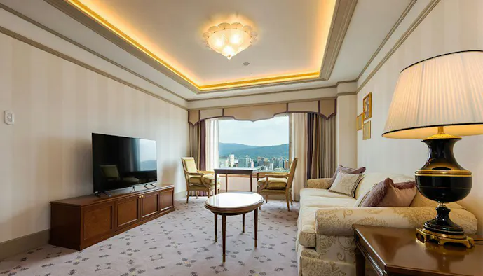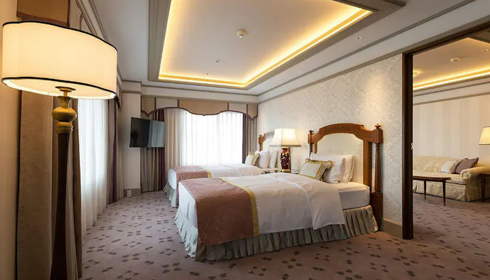 そのうちの一つ「禁煙 エグゼクティブスイート ツインルーム」は、ゆとりある約78平米。天井には新たに間接照明が取り入れられるなど、より優雅なヨーロピアンテイストの趣に。全身浴と半身浴ができる浴槽のほか、マイクロナノバブルシャワーまで設置され、寛ぎのバスタムを過ごせます。入浴後はぜひ、ミニバーを利用して。冷蔵庫内のドリンクは京都らしさにこだわったラインナップで、アルコールも含めて無料です。まるでヨーロッパの城を訪ねたような気分にさせてくれる「ホテル日航プリンセス京都」。エレガントな京都ステイが叶います。