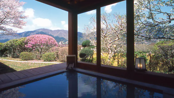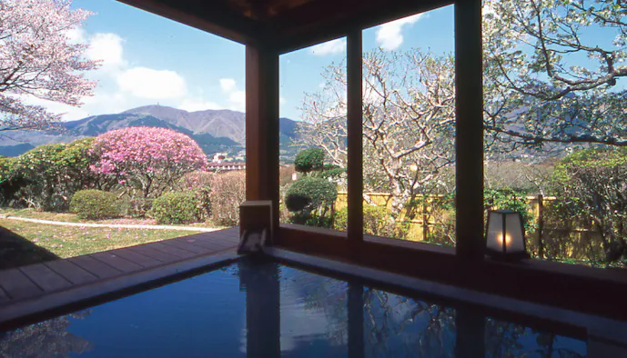 大涌谷から引湯する、硫黄成分を豊富に含んだ白濁湯が特徴で、そのpH値は2.0。強酸性の泉質は、肌の角質を溶かす効果が期待できます。硫黄成分が凝縮した湯の花がお湯の中を舞う様子は、幻想的な湯浴みとなりそう。