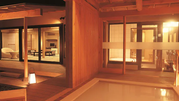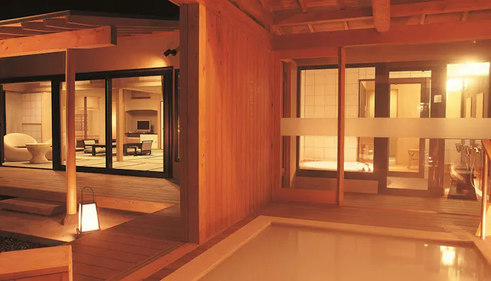 泉質は中性の「ナトリウム・カルシウム-塩化物・硫酸塩温泉」で、鉄分を多く含んだあめ色の湯が特徴。12室全てのお部屋に露天風呂が備えられているので、関節痛や冷え性にも効果が期待できる自家源泉を、掛け流しで独り占めできます。客室によって、浴槽がヒノキ風呂または石風呂と異なるので、お好みに合わせてチョイスして。
