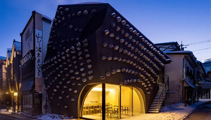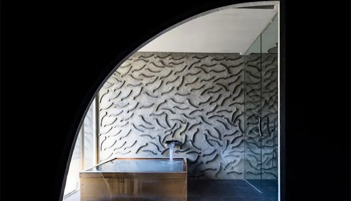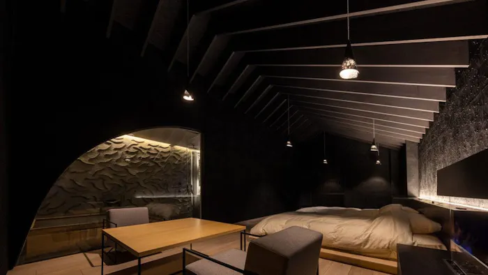 草津温泉の代名詞“湯畑”を一望する場所に佇む「きむらや」。建築家・隈研吾氏が手掛けた個性的な設計は、お部屋の中まで黒を基調とする落ち着いたデザインで、大人旅にぴったり。1日1室限定なので周りを気にすることもありません。また、チェックアウトが12時に設定されているので、朝にもゆっくり湯浴みをしてから出発できます。