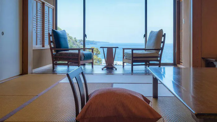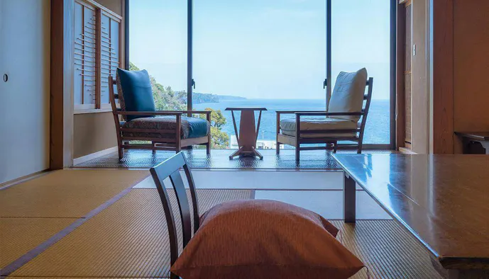 東京からもアクセスが便利な伊豆エリア。「全室源泉かけ流し露天風呂付の宿 いさり火」は、そんな伊豆半島の東側に位置する温泉宿です。こちらもチェックアウトは12時。朝食の前後にゆっくりと湯浴みで寛ぐのも良いですね。全室が駿河湾に面しているので、時とともに表情を変える伊豆の海に見守られる、贅沢で“柔らかい時間”が流れます。