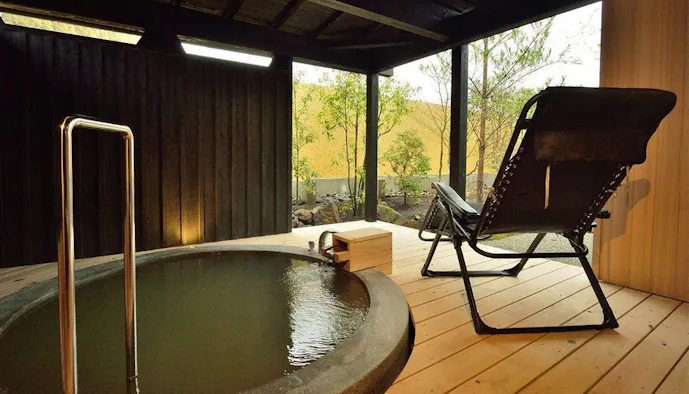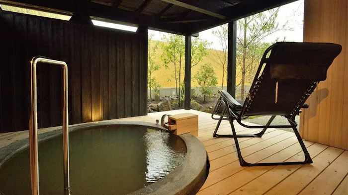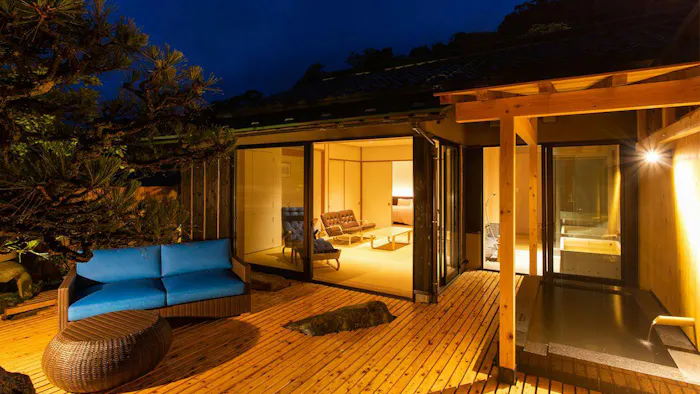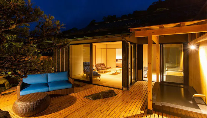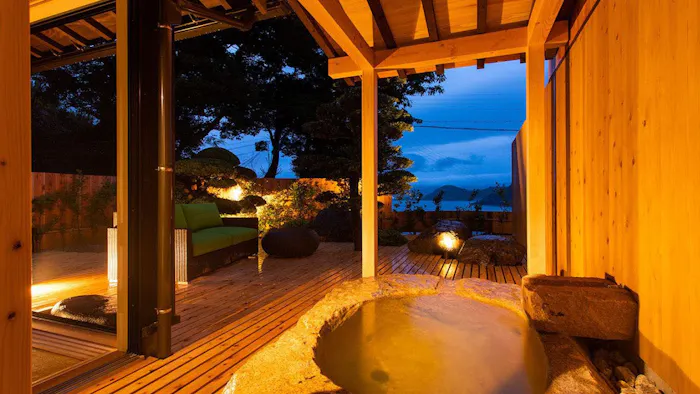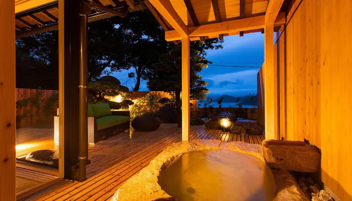 日本海に面した京丹後・久美浜は、一遍上人が念仏を唱え、青龍が姿を現したという伝説が残る風光明媚な場所。美しい景観に溶け込むように佇む「いっぺん庵」は、全室に源泉掛け流しの露天風呂が備わる、1日7組限定のスモールラグジュアリーな温泉旅館です。湯船を満たす蒲井温泉は“長者の湯”と称される鶯色の濁り湯。保温効果が高く冷え性などに効果が期待できるのだとか。