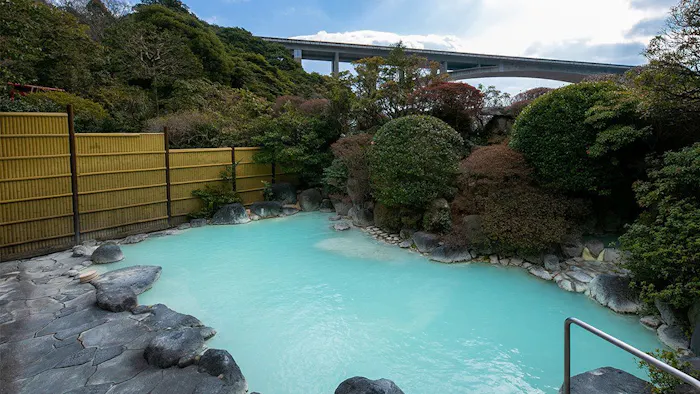 国内外にその名を轟かす温泉郷、大分県別府。1875年(明治8年)創業の老舗「別府明礬温泉 岡本屋旅館」の温泉は、青磁のように青みがかった乳白色。明礬硫黄泉と称される単純硫黄泉で、神経痛や冷え性、皮膚病などに効果が期待できるのだとか。別府八湯のなかでもとりわけ効能が高いとも言われています。