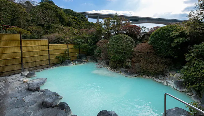 5.青みがかった白濁の明礬泉と別府の街を見晴らす眺望に、心解き放たれる