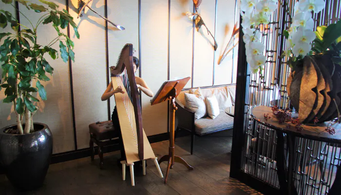 ハープの生演奏が優雅さに拍車をかけて、ラグジュアリーなひと時を演出してくれます。