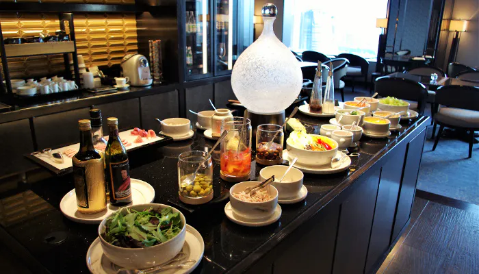 朝食はクラブラウンジの他、45階のレストランでも無料でいただくことができます。そちらはお料理の種類がより多いので、朝からたくさん召し上がりたい方にはお勧めです。が、クラブラウンジでは、朝からシャンパンもいただけ、ホテル滞在ならではの非日常感にどっぷり浸れるので、私はこちらに一票です。