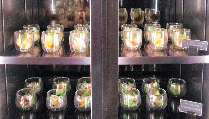 中身が見えるようになっている冷蔵庫には、サーモンリエットのイクラ和え、知床鶏のガランティースとマンゴーなどアミューズブーシュにぴったりの小鉢が用意されています。