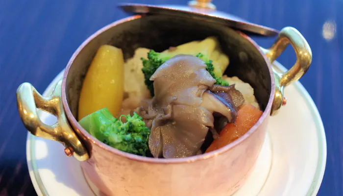 ホットミールの一人分ミニポット。器の下はホットプレートになっていて、いつでも温かさがキープされています。こちらはヘルシーな温野菜。