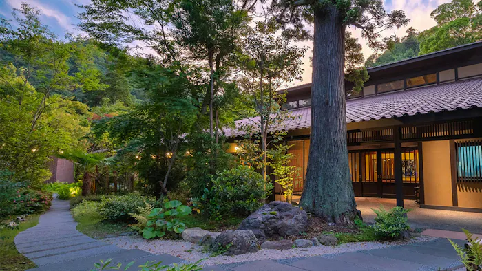 1,400坪の緑に囲まれた敷地に10棟の離れを有する宿で、全室100平米以上。すべての離れで御所泉源、あるいは妬泉源の有馬の湯が楽しめるほか、ドライサウナのような「サーマルルーム」まで備わっています。