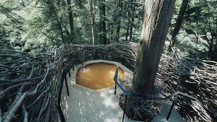 今、大注目を集めているのが「ツリーハウス温泉露天・低温サウナ付ヴィラ コルボ・デ・オウロ」。このお部屋の露天風呂はなんと、世界初というツリーハウス型!有馬の森に浮かぶ鳥の巣そのもののようなデザインで、その存在感は圧倒的。湯はもちろん有馬の名湯、金泉です。木々のざわめき、微かな葉ずれ、鳥の声。有馬の豊かな自然の中に佇む好ロケーションを生かしたこの露天風呂は、壮大な森林浴気分が味わえる特等席です。