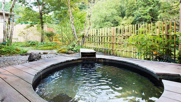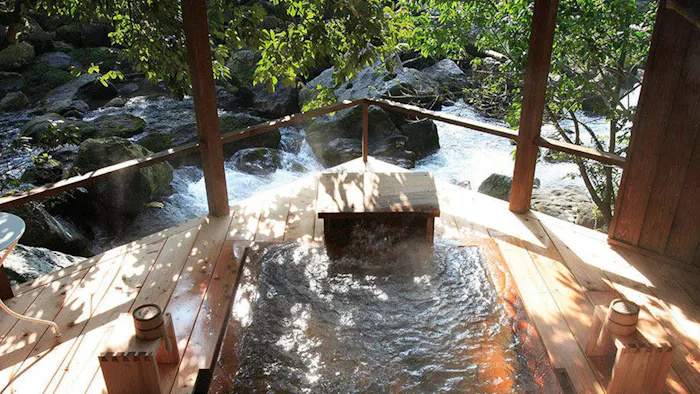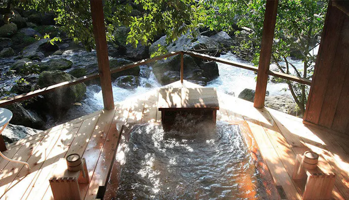 鹿児島空港ICから車でわずか15分とは思えない深い山間に佇む「妙見石原荘」。天隆川に手が届く野天風呂も、意匠が異なる2つの貸切露天も大浴場も、ナトリウム・カルシウム・マグネシウム炭酸水素塩泉。湯に浸かると肌に泡がシュワシュワと!熱交換器で湯温を下げているだけなので、温泉成分そのままの湯が楽しめます。