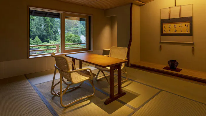 「【本館 和洋室/川側】~蘇芳・すおう~露天風呂付/ 6月新装」は4階から川を見下ろす和洋室で、2023年6月にリニューアル。露天風呂のほか、スチームサウナも完備しています。左官職人・久住有生氏が手掛けた塗壁をはじめ、自然素材のインテリアと対岸の杉木立が溶け合って柔らかな空間に仕上がっており、心静かに過ごせますよ。