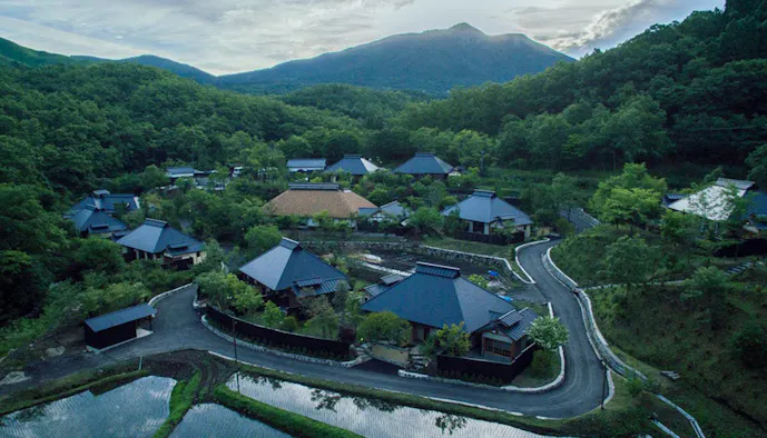 湯めぐり手形で人気を博した黒川温泉。硫化ガスが湧き出る観光スポット「すずめ地獄」に向う途中にある「山みず木別邸 深山山荘」は、里山作りから始めた宿。冬はスタッドレスタイヤが必須ですが、周りは深い緑に囲まれて、大自然の中でのんびりと、と願う人にはうってつけのロケーションです。