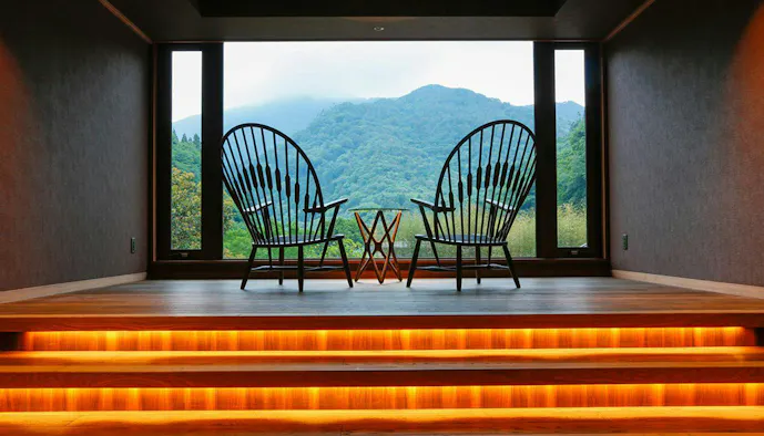 「湯山荘 阿讃琴南」が立つのは、香川県南部、阿讃山脈北麓の土器川沿い。高松空港から車で30分程度ですが、宿のどこからでも山脈の稜線が見渡せる、眺め自慢の湯宿です。4階建ての本館と山荘スタイルのヒュッテに計28室。たとえば「専有露天風呂付和洋室 Type D」は、露天風呂のあるテラスに加え、大きなデイベッドを置いたウッドテラスまで設けられた、外気浴に向いたお部屋。山々の緑の重なりを飽くまで眺めて過ごせます。
